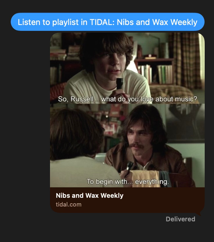 Nibs and Wax Weekly - Tidal PlaylistShelbiOct 05, 2025ShareListen HereThanks for reading Nibs and Wax ! Subscribe for free to receive new posts and support my work.SubscribePrevious